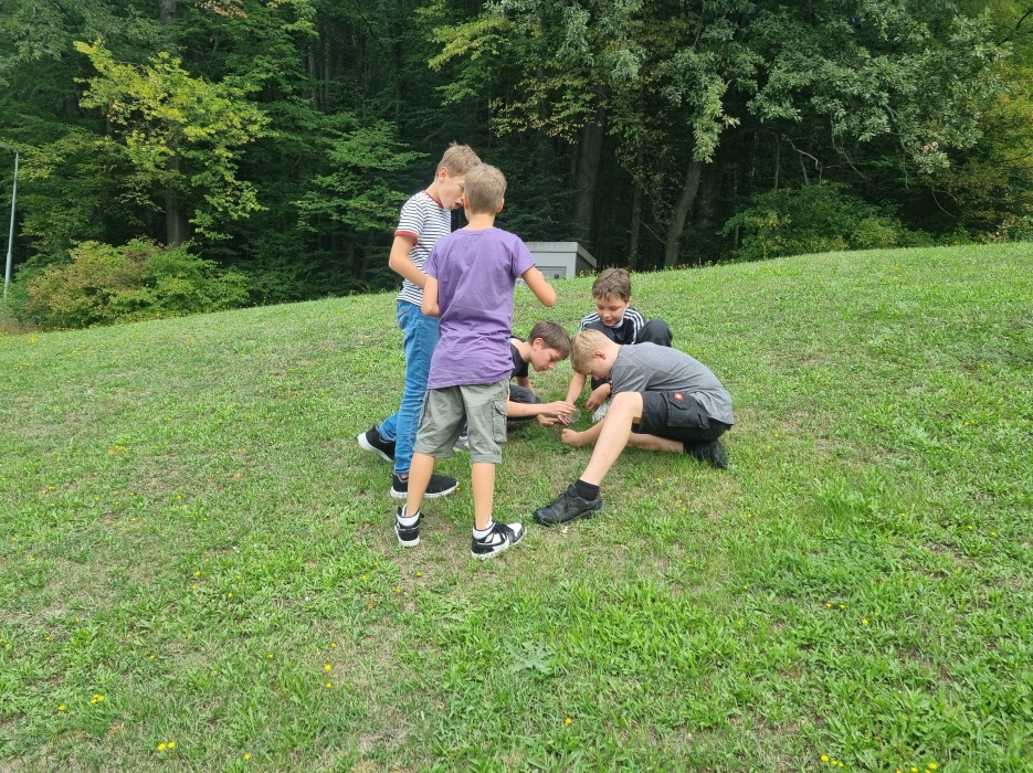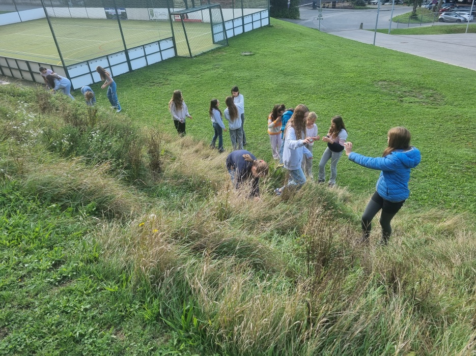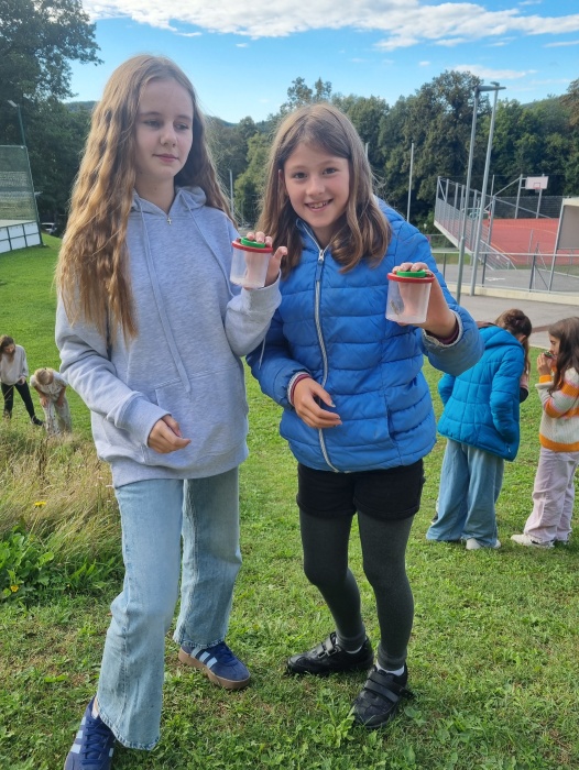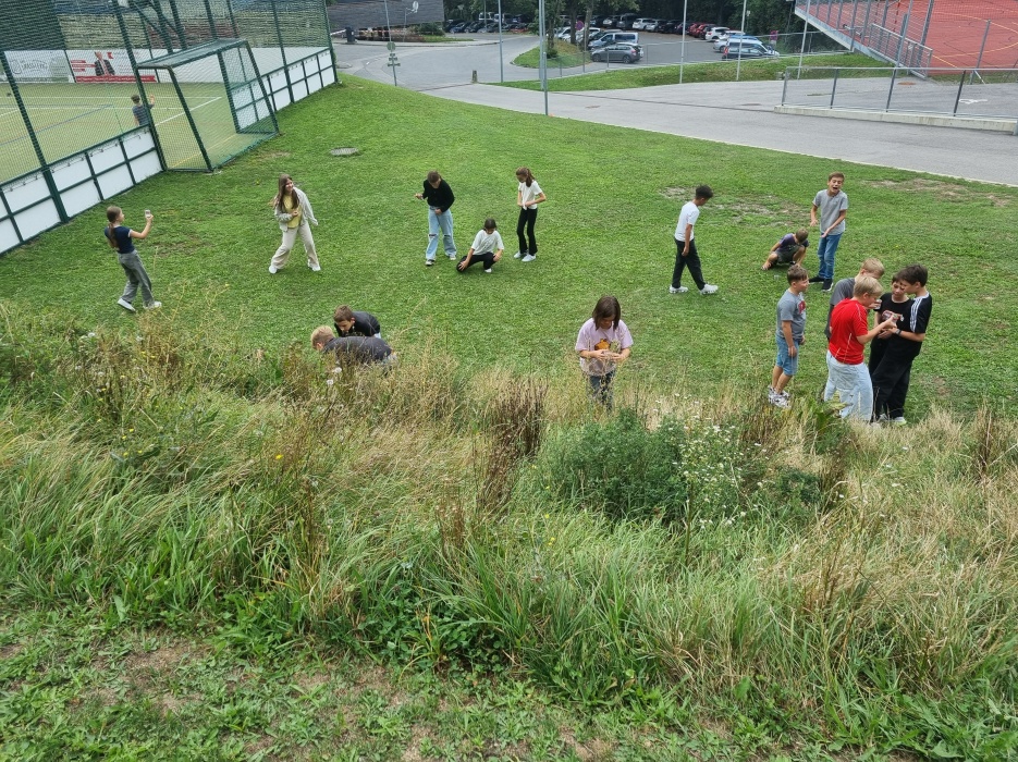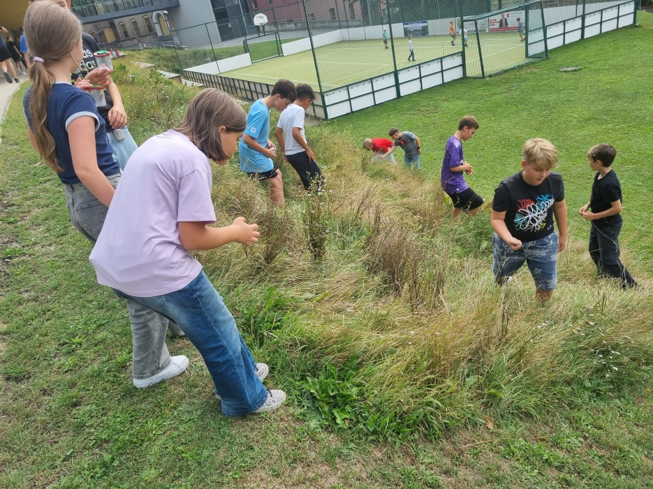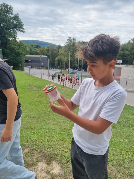 rund um das Schulgelände. Ausgerüstet mit Becherlupen und Bestimmungsliteratur