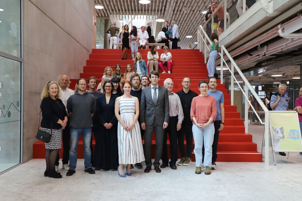 Direktorin Mag. Tanja Radinger begrüßte auf der Feststiege die Schulgemeinschaft, zahlreiche Gäste sowie den Gründungslandesschulrat Hofrat Mag. Rainer Ristl und den ehemaligen Fachinspektor für Bildnerische Erziehung Hofrat Mag. Leopold Kogler.