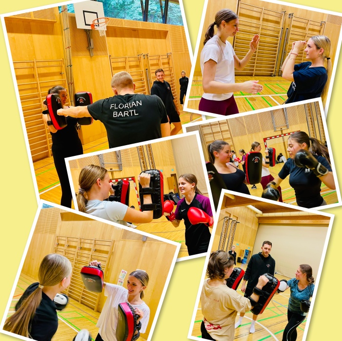 Am Dienstag, dem 7. Oktober, durften unsere Schülerinnen im Sportunterricht eine ganz besondere Trainingseinheit erleben: Der Kickbox Club Eichgraben war zu Gast an unserer Schule und gab einen spannenden Einblick in die Sportart Kickboxen. Unter der Anleitung von Flo, dem Leiter des Vereins – und übrigens ein ehemaliger Schüler unserer Schule – konnten die Jugendlichen erste Techniken kennenlernen, ihre Koordination trainieren und vor allem eines: mit viel Freude aktiv sein.