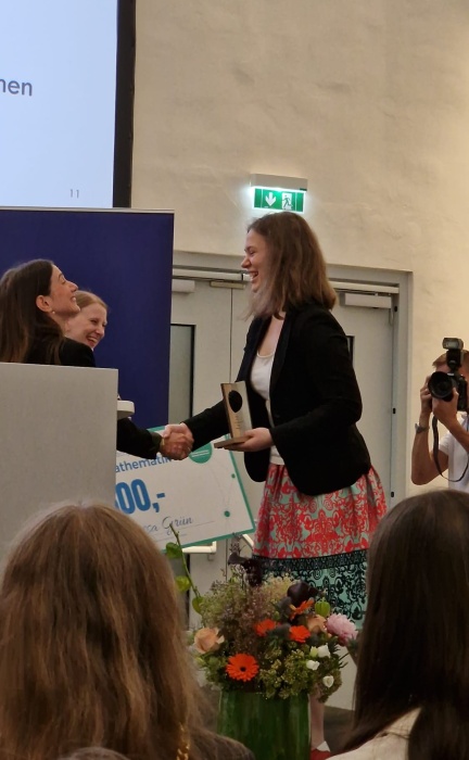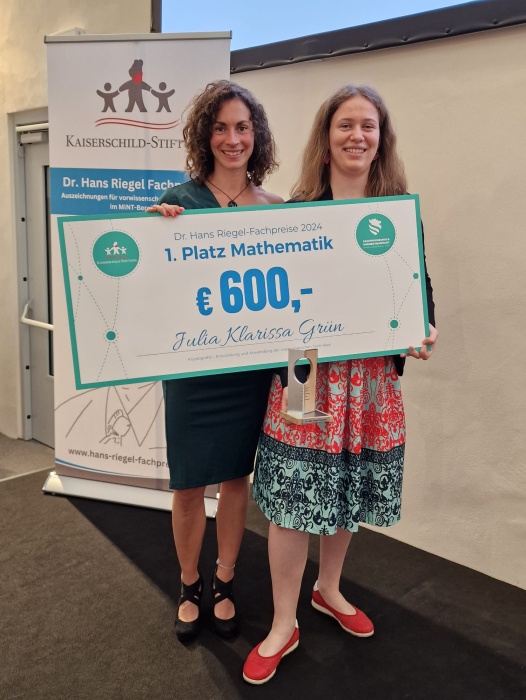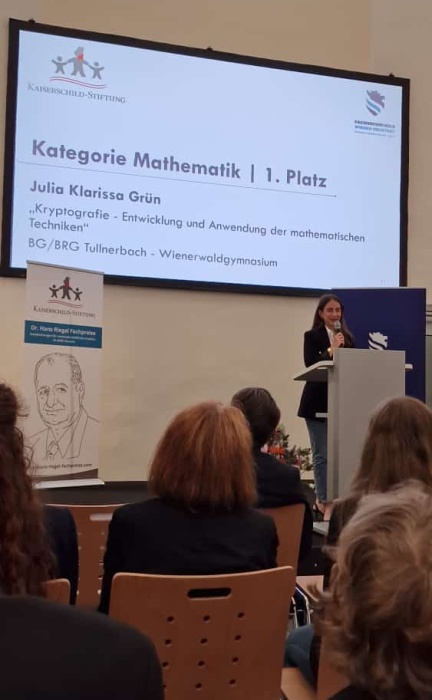 Sowohl die selbstgerechneten Praxisbeispiele, als auch der Ausblick auf die Quantenkryptografie hat Julia zum 1. Platz in der Kategorie Mathematik des Dr. Hans-Riegel-Fachpreis (dem Preis der österreichischen Kaiserschild-Stiftung des Haribo-Firmengründers) verholfen. Julia konnte sich hier nicht nur mit ihrer VWA gegen andere hervorragende VWAs aus dem Themenbereich der Mathematik durchsetzen, sondern sich auch die Prämie von 600€ sichern. Auch an die Schule der jeweiligen erstplatzierten VWA ging ein Preis: Betreuungslehrerin Mag. Clarissa Friedrichkeit-Miko konnte sich für ihre Betreuungsarbeit über einen Gutschein im Wert von 250€ für naturwissenschaftliche Lehrmittel freuen.