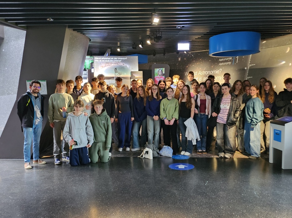 Zum Abschluss der Woche begaben sich die Klassen ins ESO Supernova Planetarium in Garching. Nach einer immersiven Planetarium-Show und dem Besuch der dazugehörigen Ausstellung folgte ein wissenschaftlicher Höhepunkt: Herr Prof. Dr. Andreas Burkert, renommierter Astrophysiker, hielt einen fesselnden Vortrag zum Thema „Sind wir allein im Universum?“. Mit verständlicher Sprache, fachlicher Tiefe und viel Raum für Fragen eröffnete er einen faszinierenden Einblick in die moderne Astronomie und regte zum Nachdenken über unsere Rolle im Kosmos an.